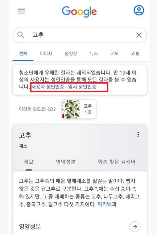 고추라는 채소를 검색하였는데 위와같이 성인인증이 뜨실 수 있습니다.